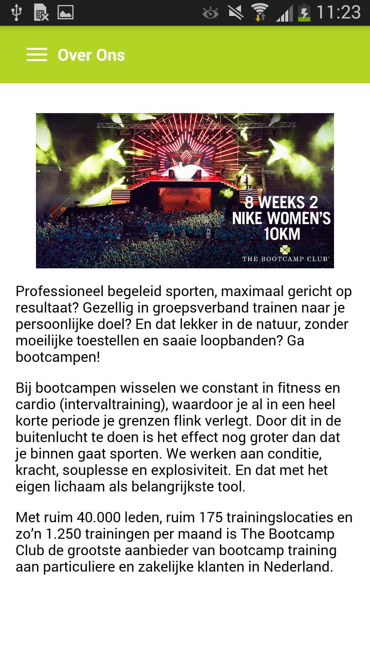 在The Bootcamp Club您在专业指导下进行的训练营俱乐部,最大程度地关注结果。在小组中为您的个人目标进行舒适的培训。那本质上很好,没有困难的设备和无聊的跑步机!荷兰各地有175多个地点,每月有1,500次培训课程,您可以随时在附近的某个地方来找我们。使用此应用程序,您可以注册并进行培训检查,您可以购买订阅。您也有机会在我们的合作伙伴之一中赢得大量折扣或免费产品。您可以参加我们的忠诚度计划。